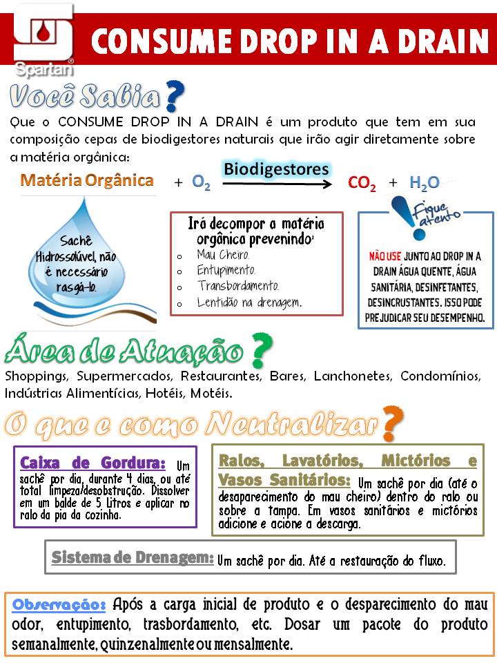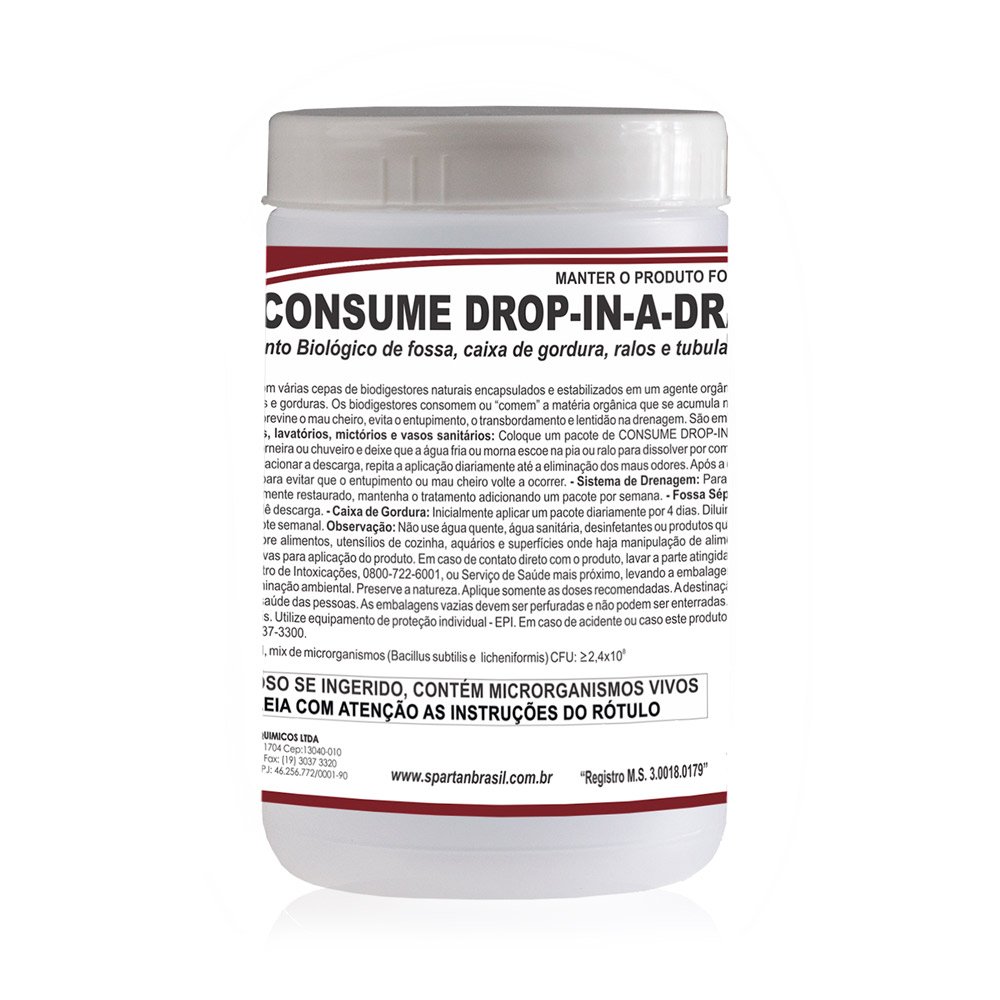 <blockquote style="color: rgb(0, 0, 255); font-family: ‘Times New Roman’; font-size: medium; line-height: normal;"><p align="JUSTIFY"><font face="Verdana" size="2"><strong>Propriedades:</strong><br>Formulado com várias cepas de biodigestores naturais encapsulados e estabilizados em um agente orgânico com capacidade de degradar altos níveis de resíduos orgânicos, incluindo açúcares, carboidratos, proteínas e gorduras. Os biodigestores consomem ou “comem” a matéria orgânica que se acumula nos ralos, tubulações, caixa de gordura, sistema de drenagem e fossa séptica. CONSUME DROP-IN-A-DRAIN previne o mau cheiro, evita o entupimento, o transbordamento e lentidão na drenagem. São embalados individualmente em embalagens hidrossolúveis contendo 10 gramas.</font></p><p align="JUSTIFY"><font face="Verdana" size="2"><strong>Instruções de uso:</strong><br>- Ralos, lavatórios, mictórios e vasos sanitários: Coloque um pacote de CONSUME DROP-IN-A-DRAIN dentro do ralo ou sobre a tampa do ralo. Não retire a embalagem hidrossolúvel. Abra um pouco a torneira ou chuveiro e deixe que a água fria ou morna escoe na pia ou ralo para dissolver por completo o pacote do CONSUME DROP-IN-A-DRAIN. No caso de vasos sanitários e mictórios, aplicar diretamente e acionar a descarga, repita a aplicação diariamente até a eliminação dos maus odores. Após a eliminação dos maus odores, aplicar um pacote mensal, quinzenal ou semanal, dependendo da carga orgânica para evitar que o entupimento ou mau cheiro volte a ocorrer. – Sistema de Drenagem: Para drenagem lenta, adicione um pacote diariamente para desobstruir o sistema. Quando o fluxo estiver completamente restaurado, mantenha o tratamento adicionando um pacote por semana. – Fossa Séptica: Adicionar um pacote por semana para cada pessoa que contribui para o sistema. Adicione no sanitário e dê descarga. – Caixa de Gordura: Inicialmente aplicar um pacote diariamente por 4 dias. Diluir cada pacote em um balde de 5 litros e aplicar no ralo da pia da cozinha. A partir da 4ª aplicação, adicione um pacote semanal. Observação: Não use água quente, água sanitária, desinfetantes ou produtos químicos desincrustantes que podem reduzir o desempenho do produto.</font></p><p><font face="Verdana" size="2"><strong>Dados Técnicos:</strong></font></p></blockquote><div align="center" style="color: rgb(0, 0, 255); font-family: ‘Times New Roman’; font-size: medium; line-height: normal;"><center><table border="0" width="80%" cellpadding="0"><tbody><tr><td width="38%"><small><font face="Verdana">Aparência:</font></small></td><td width="62%"><small><strong><font face="Verdana">Pó</font></strong></small></td></tr><tr><td width="38%"><small><font face="Verdana">Cor:</font></small></td><td width="62%"><small><strong><font face="Verdana">Castanho</font></strong></small></td></tr><tr><td width="38%"><small><font face="Verdana">Odor:</font></small></td><td width="62%"><small><strong><font face="Verdana">Caracteristico</font></strong></small></td></tr><tr><td width="38%"><small><font face="Verdana">pH:</font></small></td><td width="62%"><small><strong><font face="Verdana">6,5 – 8,5 (Sol.1%)</font></strong></small></td></tr><tr><td width="38%"><small><font face="Verdana">Peso específico:</font></small></td><td width="62%"><small><strong><font face="Verdana">0,660 – 0,770</font></strong></small></td></tr><tr><td width="38%"><small><font face="Verdana">Viscosidade:</font></small></td><td width="62%"><small><strong><font face="Verdana">Não Aplicavel</font></strong></small></td></tr><tr><td width="38%"><small><font face="Verdana">Teor de ativos:</font></small></td><td width="62%"><small><strong><font face="Verdana">Não Aplicavel</font></strong></small></td></tr><tr><td width="38%" valign="top"><font face="Verdana"><small>CFU (Total):</small></font></td><td width="62%"><small><strong><font face="Verdana">≥240.000.000</font></strong></small></td></tr><tr><td width="38%"></td><td width="62%"></td></tr><tr><td width="38%"><strong><font face="Verdana"><small>Registro do<br>Ministério da Saúde:</small></font></strong></td><td width="62%" valign="bottom"><small><strong><font face="Verdana">Produto registrado na ANVISA/MS sob n° 3.0018.0179</font></strong></small></td></tr></tbody></table></center></div><blockquote style="color: rgb(0, 0, 255); font-family: ‘Times New Roman’; font-size: medium; line-height: normal;"><p align="JUSTIFY"><font face="Verdana" size="2"><strong>Garantia:</strong><br>Produção moderna e rigoroso controle de laborátorio asseguram qualidade uniforme por todo o tempo. Assim, todos os produtos manufaturados pela Spartan do Brasil são garantidos para a total satisfação do usuário.</font></p></blockquote>