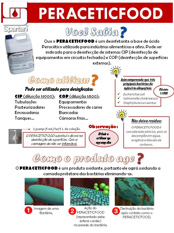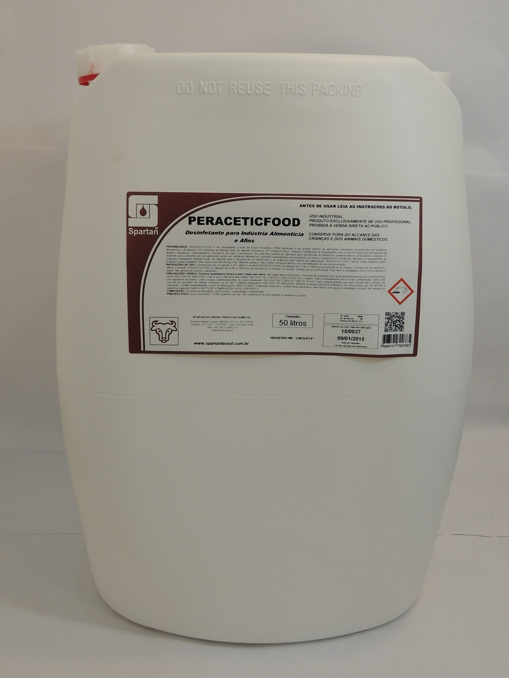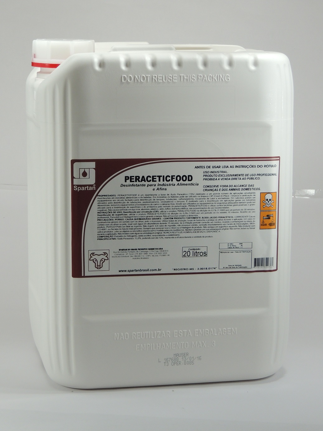<blockquote style="color: rgb(0, 0, 255); font-family: ‘Times New Roman’; font-size: medium; line-height: normal;"><p align="JUSTIFY"><font face="Verdana" size="2"><strong>Propriedades:</strong><br>PERACETICFOOD é um desinfetante a base de Ácido Peracético (15%) destinado a um grande número de aplicações envolvendo desinfecções em indústrias alimentícias e de bebidas. Em Indústrias de Bebidas pode ser utilizado na limpeza CIP (Clean-In-Place – limpeza e sanitização de equipamentos em circuito fechado) para desinfecção de tanques, tubulações, carbonatadores, trocadores de calor e enchedores. Em Laticínios podem ser utilizados para desinfecção de tubulações, pasteurizadores, envasadoras e tanques. É destinado para a desinfecção em aplicações gerais em Indústrias Alimentícias, incluindo equipamentos processadores de carne e câmaras frias. Desde que utilizados os equipamentos de segurança adequados também pode ser utilizado para a desinfecção de superfícies e de ambientes pelo método de pulverização. PERACETICFOOD é eficaz contra bactérias gram-positivas e gram-negativas. Não causa corrosão em aço inox, alumínio, plástico, vidro, teflon, borracha nitrílica, nas concentrações de uso recomendadas.</font></p><p align="JUSTIFY"><font face="Verdana" size="2"><strong>Instruções de uso:</strong><br>Desinfecção por circulação (CIP): utilizar o produto PERACETICFOOD na diluição de 0,1% (1:1000) por um período de 30 minutos. Desinfecção de superfícies: utilizar o produto PERACETICFOOD na diluição de 0,2% (1:500) por um período de no mínimo 10 minutos. Restrito ao uso profissional. Para abrir a embalagem force o lacre girando a tampa. Não armazenar próximo a alimentos.</font></p><p><font face="Verdana" size="2"><strong>Dados Técnicos:</strong></font></p></blockquote><div align="center" style="color: rgb(0, 0, 255); font-family: ‘Times New Roman’; font-size: medium; line-height: normal;"><center><table border="0" width="80%" cellpadding="0"><tbody><tr><td width="38%"><small><font face="Verdana">Aparência:</font></small></td><td width="62%"><small><strong><font face="Verdana">Liquido Transparente</font></strong></small></td></tr><tr><td width="38%"><small><font face="Verdana">Cor:</font></small></td><td width="62%"><small><strong><font face="Verdana">Incolor</font></strong></small></td></tr><tr><td width="38%"><small><font face="Verdana">Odor:</font></small></td><td width="62%"><small><strong><font face="Verdana">Caracteristico</font></strong></small></td></tr><tr><td width="38%"><small><font face="Verdana">pH:</font></small></td><td width="62%"><small><strong><font face="Verdana">0,0 – 2,0</font></strong></small></td></tr><tr><td width="38%"><small><font face="Verdana">Peso específico:</font></small></td><td width="62%"><small><strong><font face="Verdana">1,124 – 1,181 g/cm³</font></strong></small></td></tr><tr><td width="38%"><small><font face="Verdana">Viscosidade:</font></small></td><td width="62%"><small><strong><font face="Verdana">NA</font></strong></small></td></tr><tr><td width="38%"><small><font face="Verdana">Teor de ativos:</font></small></td><td width="62%"><small><strong><font face="Verdana">22,0 – 26,0</font></strong></small></td></tr><tr><td width="38%" valign="top"><font face="Verdana"><small>Teor de Peroxido de Hidrogênio:</small></font></td><td width="62%"><small><strong><font face="Verdana">28,0 – 39,0%</font></strong></small></td></tr><tr><td width="38%" valign="top"><font face="Verdana"><small>Teor de Ácido Peracético:</small></font></td><td width="62%"><small><strong><font face="Verdana">11,0 – 17,5%</font></strong></small></td></tr><tr><td width="38%"></td><td width="62%"></td></tr><tr><td width="38%"><strong><font face="Verdana"><small>Registro do<br>Ministério da Saúde:</small></font></strong></td><td width="62%" valign="bottom"><small><strong><font face="Verdana">Produto registrado na ANVISA/MS sob n° 3.0018.0174</font></strong></small></td></tr></tbody></table></center></div><blockquote style="color: rgb(0, 0, 255); font-family: ‘Times New Roman’; font-size: medium; line-height: normal;"><p align="JUSTIFY"><font face="Verdana" size="2"><strong>Garantia:</strong><br>Produção moderna e rigoroso controle de laborátorio asseguram qualidade uniforme por todo o tempo. Assim, todos os produtos manufaturados pela Spartan do Brasil são garantidos para a total satisfação do usuário.</font></p></blockquote>
