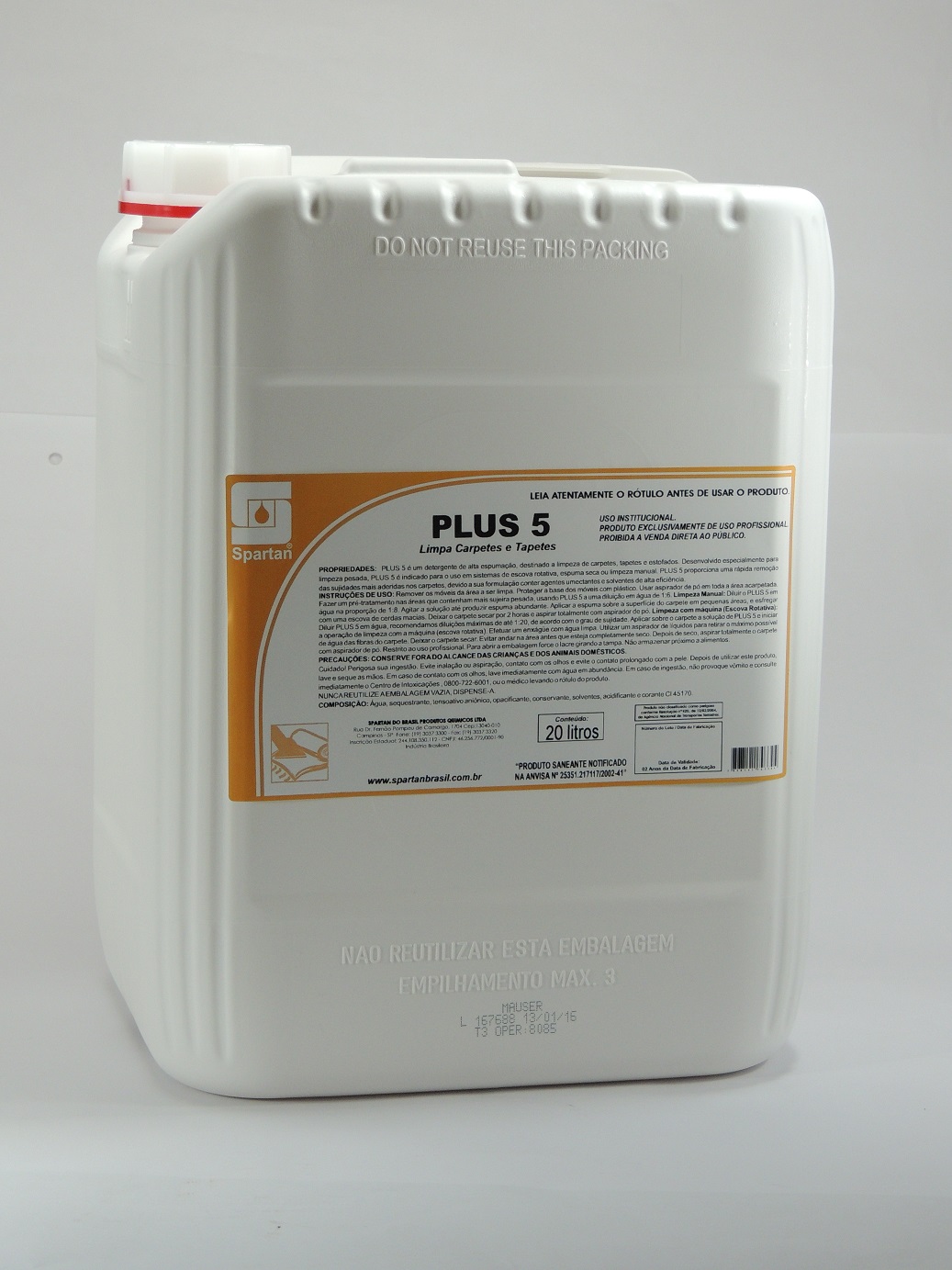 <blockquote style="color: rgb(0, 0, 255); line-height: normal; font-family: &quot;Times New Roman&quot;; font-size: medium;"><p align="JUSTIFY"><font face="Verdana" size="2"><strong>Propriedades:</strong><br>PLUS 5 é um detergente concentrado de alta espumação, destinado a limpeza de carpetes, tapetes e estofados.<br>Desenvolvido especialmente para limpeza pesada, PLUS 5 é indicado para o uso em sistemas de escova rotativa, espuma seca ou limpeza manual. PLUS 5 proporciona uma rápida remoção das sujidades mais aderidas nos carpetes, devido a sua formulação conter agentes umectantes e solventes de alta eficiência.<br></font></p><p align="JUSTIFY"><font face="Verdana" size="2"><strong>Instruções de uso:</strong><br>-Remover os móveis da área a ser limpa. Proteger a base dos móveis com plástico.<br>-Usar aspirador de pó em toda a área acarpetada.<br>-Fazer um pré-tratamento nas áreas que contenham sujeira pesada, usando o PLUS 5 a uma diluição em água de 1:6.<br>-Limpeza manual: Diluir o PLUS 5 em água na proporção de 1:8. Agitar a solução até produzir espuma abundante. Aplicar a espuma sobre a superfície do carpete em pequenas áreas, e esfregar com uma escova de cerdas macias. Deixar o carpete secar por 02 horas e aspirar totalmente com aspirador de pó.<br>-Limpeza com máquina (Escova Rotativa): Diluir PLUS 5 em água, recomendamos diluições máximas de até 1:20 de acordo com o grau de sujidade. Aplicar sobre o carpete a solução de PLUS 5 e iniciar a operação de limpeza com a máquina (escova rotativa). Efetuar um enxágue com água limpa. Utilizar um aspirador de líquidos para retirar o máximo possível de água das fibras do carpete.<br>-Deixar o carpete secar. Evitar andar na área antes que esteja completamente seco.<br>-Depois de seco, aspirar totalmente o carpete com aspirador de pó.<br></font></p><p><font face="Verdana" size="2"><strong>Dados Técnicos:</strong></font></p></blockquote><div align="center" style="color: rgb(0, 0, 255); line-height: normal; font-family: &quot;Times New Roman&quot;; font-size: medium;"><center><table width="80%" border="0" cellpadding="0"><tbody><tr><td width="38%"><small><font face="Verdana">Aparência:</font></small></td><td width="62%"><small><strong><font face="Verdana">Líquido Turvo</font></strong></small></td></tr><tr><td width="38%"><small><font face="Verdana">Cor:</font></small></td><td width="62%"><small><strong><font face="Verdana">Levemente Rosa</font></strong></small></td></tr><tr><td width="38%"><small><font face="Verdana">Odor:</font></small></td><td width="62%"><small><strong><font face="Verdana">Característico</font></strong></small></td></tr><tr><td width="38%"><small><font face="Verdana">pH:</font></small></td><td width="62%"><small><strong><font face="Verdana">7,0 – 9,0</font></strong></small></td></tr><tr><td width="38%"><small><font face="Verdana">Peso específico:</font></small></td><td width="62%"><small><strong><font face="Verdana">0,980 – 1,030 g/cm3</font></strong></small></td></tr><tr><td width="38%"><small><font face="Verdana">Viscosidade:</font></small></td><td width="62%"><small><strong><font face="Verdana">1,0 – 10,0 cps</font></strong></small></td></tr><tr><td width="38%"><small><font face="Verdana">Teor de ativos:</font></small></td><td width="62%"><small><strong><font face="Verdana">7,0 – 9,0 %</font></strong></small></td></tr><tr><td width="38%"></td><td width="62%"></td></tr><tr><td width="38%"><strong><font face="Verdana"><small>Registro do<br>Ministério da Saúde:</small></font></strong></td><td width="62%" valign="bottom"><small><strong><font face="Verdana">Produto notificado na ANVISA – 25351.217117/2002-41</font></strong></small></td></tr></tbody></table></center></div><blockquote style="color: rgb(0, 0, 255); line-height: normal; font-family: &quot;Times New Roman&quot;; font-size: medium;"><p align="JUSTIFY"><font face="Verdana" size="2"><strong>Garantia:</strong><br>Produção moderna e rigoroso controle de laborátorio asseguram qualidade uniforme por todo o tempo. Assim, todos os produtos manufaturados pela Spartan do Brasil são garantidos para a total satisfação do usuário.</font></p></blockquote>