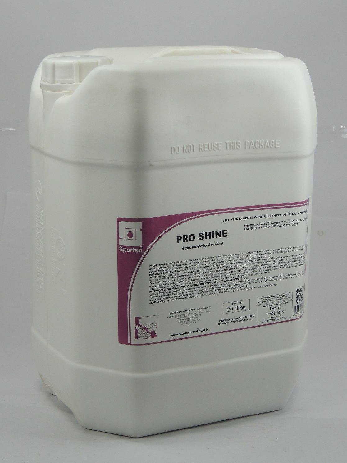 <blockquote style="color: rgb(0, 0, 255); font-family: ‘Times New Roman’; font-size: medium; line-height: normal;"><p align="JUSTIFY"><font face="Verdana" size="2"><strong>Propriedades:</strong><br>PRO-SHINE é um acabamento de base acrílica de alto brilho, antiderrapante e transparente desenvolvida para aplicações onde se deseja um piso brilhante, de fácil manutenção e de baixo custo.<br>PRO-SHINE é recomendado para áreas de pequeno e médio porte com baixo tráfego: hotéis, residências, escritórios, consultórios e estabelecimentos comerciais, em vários tipos de pisos como: paviflex, borracha, cerâmica, granilite, marmorite, lajotas, etc.<br></font></p><p align="JUSTIFY"><font face="Verdana" size="2"><strong>Instruções de uso:</strong><br>- A superfície deve estar limpa, isenta de acabamentos e sujidades em geral. Recomendamos utilizar SPARCLEAN, segundo as instruções de uso.<br>- Aplicar PRO-SHINE puro, com auxílio de mop aplicador ou pano. Aplicar de 04 a 06 camadas uniformes, com 30 minutos de secagem entre as camadas. O rendimento por camada é de 70 a 90 m2 por litro, dependendo da porosidade da superfície.<br>Manutenção diária:<br>- Remover pó e areia com vassoura ou mop pó.<br>- Limpar o piso com detergente neutro DAMP MOP diluido 1:40 em água, com auxilio de pano, mop úmido ou máquina conservadora (enceradeira industrial) com disco de limpeza (macio) para não danificar o brilho do acabamento.<br>- Reaplicar mensalmente ou conforme a necessidade. Antes de uma reaplicação de PRO-SHINE, o piso deve estar limpo e seco.<br></font></p><p><font face="Verdana" size="2"><strong>Dados Técnicos:</strong></font></p></blockquote><div align="center" style="color: rgb(0, 0, 255); font-family: ‘Times New Roman’; font-size: medium; line-height: normal;"><center><table border="0" width="80%" cellpadding="0"><tbody><tr><td width="38%"><small><font face="Verdana">Aparência:</font></small></td><td width="62%"><small><strong><font face="Verdana">Líquido leitoso</font></strong></small></td></tr><tr><td width="38%"><small><font face="Verdana">Cor:</font></small></td><td width="62%"><small><strong><font face="Verdana">Creme – Bege</font></strong></small></td></tr><tr><td width="38%"><small><font face="Verdana">Odor:</font></small></td><td width="62%"><small><strong><font face="Verdana">Característico</font></strong></small></td></tr><tr><td width="38%"><small><font face="Verdana">pH:</font></small></td><td width="62%"><small><strong><font face="Verdana">7,50 – 9,50</font></strong></small></td></tr><tr><td width="38%"><small><font face="Verdana">Peso específico:</font></small></td><td width="62%"><small><strong><font face="Verdana">0,990 – 1,020 g/cm³</font></strong></small></td></tr><tr><td width="38%"><small><font face="Verdana">Viscosidade:</font></small></td><td width="62%"><small><strong><font face="Verdana">1,0 – 10,0 cps</font></strong></small></td></tr><tr><td width="38%"><small><font face="Verdana">Teor de ativos:</font></small></td><td width="62%"><small><strong><font face="Verdana">12,5 – 14,5 %</font></strong></small></td></tr><tr><td width="38%"></td><td width="62%"></td></tr><tr><td width="38%"><strong><font face="Verdana"><small>Registro do<br>Ministério da Saúde:</small></font></strong></td><td width="62%" valign="bottom"><small><strong><font face="Verdana">Dispensado de Registro – Parecer Téc. CATES 14/09/2001</font></strong></small></td></tr></tbody></table></center></div><blockquote style="color: rgb(0, 0, 255); font-family: ‘Times New Roman’; font-size: medium; line-height: normal;"><p align="JUSTIFY"><font face="Verdana" size="2"><strong>Garantia:</strong><br>Produção moderna e rigoroso controle de laboratório asseguram qualidade uniforme por todo o tempo. Assim, todos os produtos manufaturados pela Spartan do Brasil são garantidos para a total satisfação do usuário</font></p></blockquote>